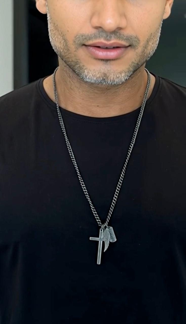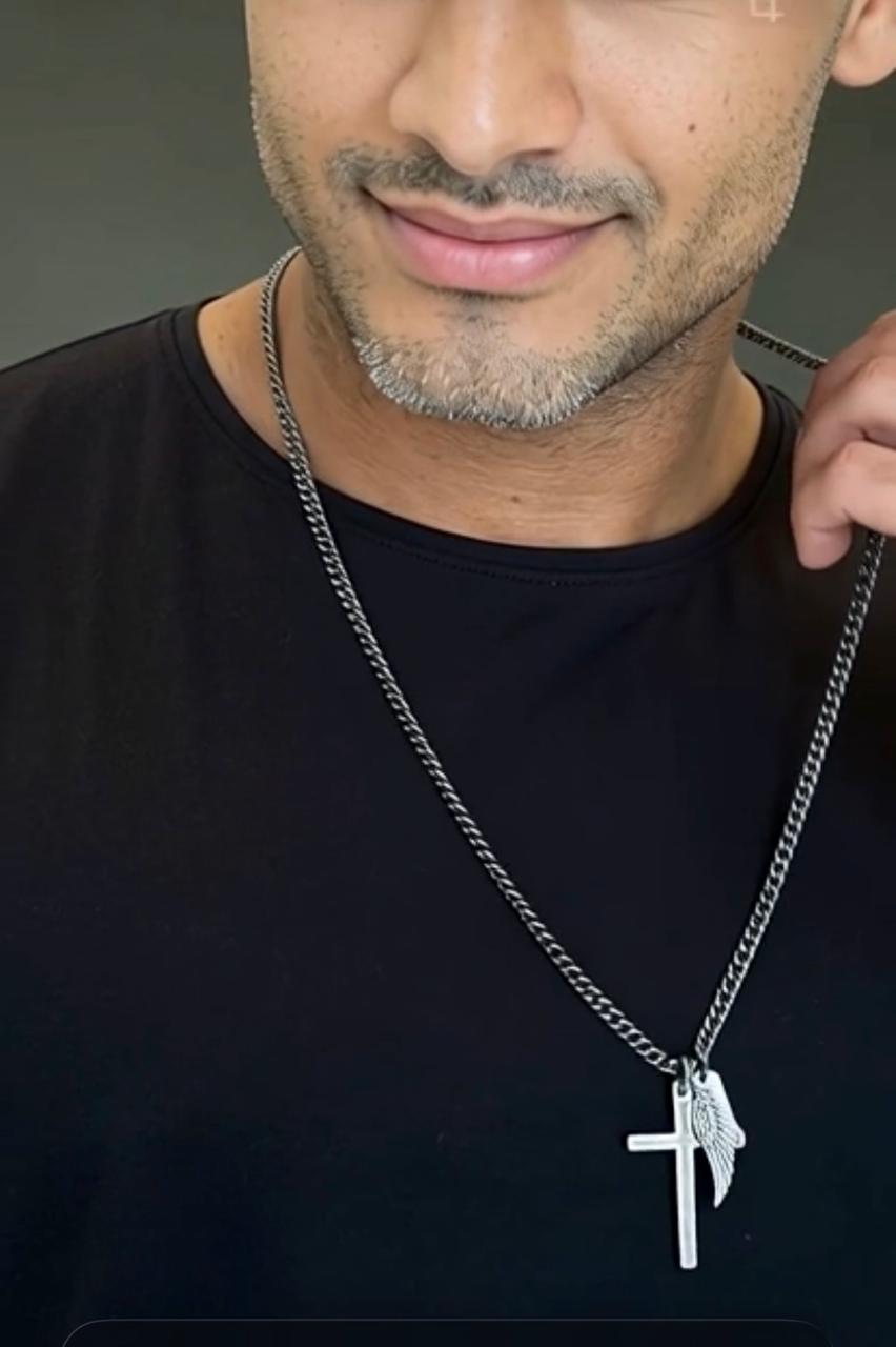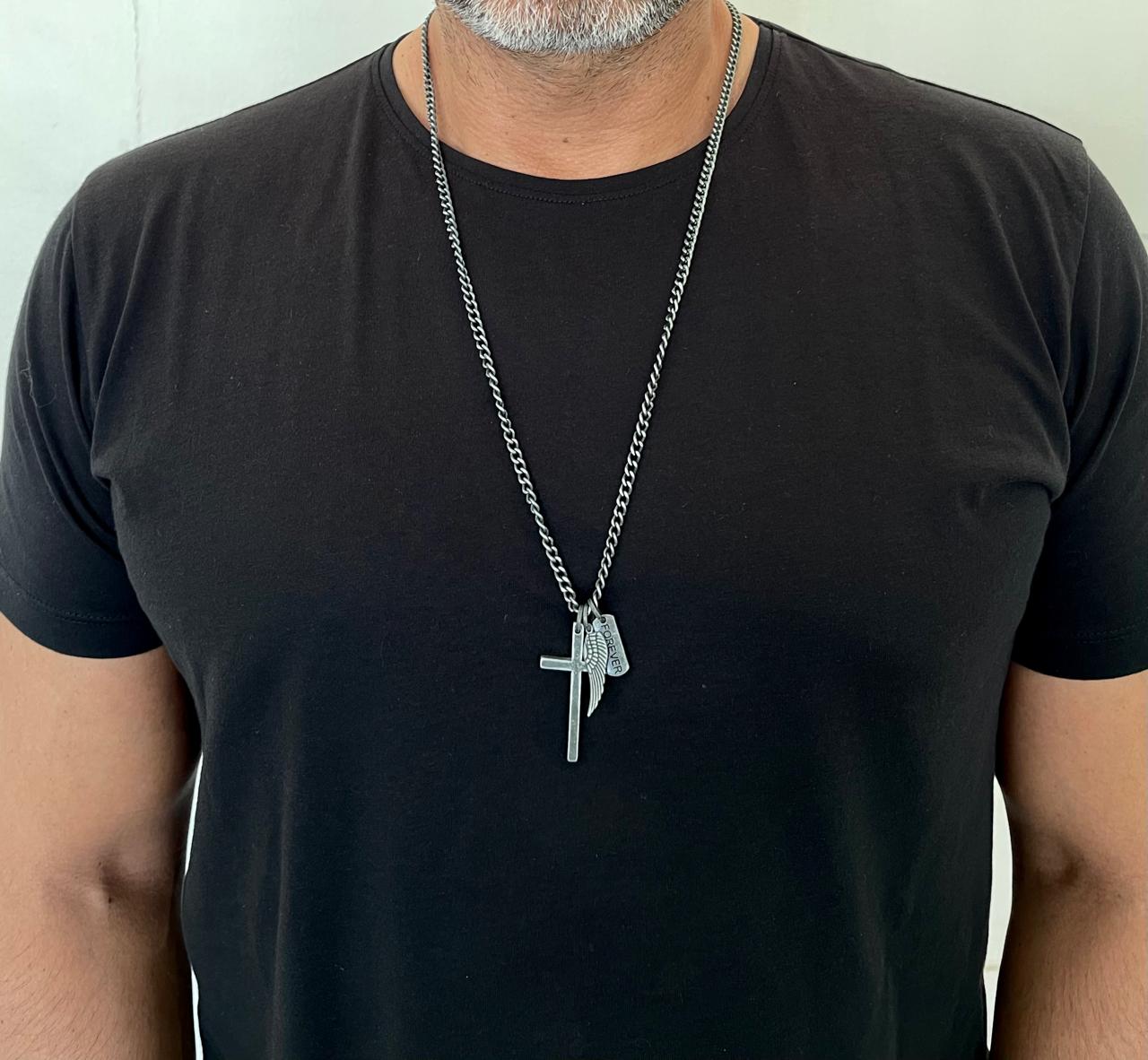 Collar de cadena Groumet de 5 mm de ancho de Metal color Plata Vieja con 3 dijes Cruz, Ala, Forever..